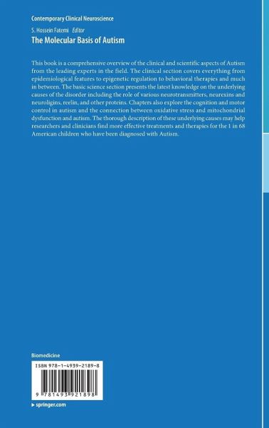 Preface.- A Brief History of Autism.- Autism Spectrum Disorder: Diagnostic Considerations.- Epidemiologic Features of Autism Spectrum Disorders.- Genetics of Autism Spectrum Disorders: The Opportunity and Challenge in the Genetics Clinic.- Epigenetic Regulation in Autism.- Immunology of Autism.- Neuroimaging in Autism Spectrum Disorders.- The Neuropathology of Autism.- Pharmacology of ASD Spectrum Disorder.- Behavioral Therapies.- Autism and Dopamine.- Autism and Glutamate.- Serotonin in Autism Spectrum Disorder: Insights From Human Studies and Animal Models.- Oxytocin and Vasopressin in Autism and Genetic Syndromes.- Molecular basis of cholinergic changes in autistic spectrum disorders and relevance for treatment interventions.- Reelin, GABA, FMRP, and Autism.- The Role of Neurexins and Neuroligins in Autism.- Neurotrophins, their receptors and autism: ligand vs. receptor abnormalities.- Cognition, Motor Control and Other Aspects of Autism: A Pragmatic Review.- Increased vulnerability to oxidative stress and mitochondrial dysfunction in autism.- Index.