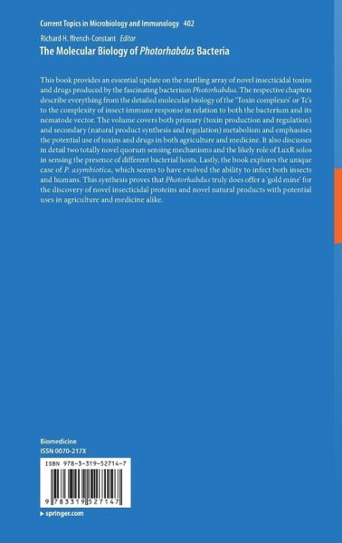 This book provides an essential update on the startling array of novel insecticidal toxins and drugs produced by the fascinating bacterium Photorhabdus. The respective chapters describe everything from the detailed molecular biology of the 'Toxin complexes' or Tc's to the complexity of insect immune response in relation to both the bacterium and its nematode vector. The volume covers both primary (toxin production and regulation) and secondary (natural product synthesis and regulation) metabolism and emphasises the potential use of toxins and drugs in both agriculture and medicine. It also discusses in detail two totally novel quorum sensing mechanisms and the likely role of LuxR solos in sensing the presence of different bacterial hosts. Lastly, the book explores the unique case of P. asymbiotica, which seems to have evolved the ability to infect both insects and humans. This synthesis proves that Photorhabdus truly does offer a 'gold mine' for the discovery ofnovel insecticidal proteins and novel natural products with potential uses in agriculture and medicine alike.