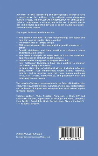 One: Introduction to Molecular Epidemiology.- 1. The Use of Molecular Epidemiology.- 2. DNA Technology for Molecular Analysis of Viruses.- 3. Phylogenetic Approaches to Molecular Epidemiology.- 4. The HIV Databases: History, Design and Function.- Two: Application of Genetic Methods to Investigate Virus Spread.- 5. The Evolution of Primate Lentiviruses and the Origins of AIDS.- 6. Recombination and Molecular Epidemiology of HIV-1 and Enteroviruses.- 7. Molecular Epidemiology of Human T Cell Leukemia/Lymphoma Viruses Type 1 and Type 2 (HTLV-1/2) and Related Simian Retroviruses (STLV-1, STLV-2 and STLV-L/3).- 8. Molecular Epidemiology, Evolution and Dispersal of the Genus Flavivirus.- 9. Molecular Epidemiology of Hepatitis C Virus.- 10. Seeking a Pale Horse: The 1918 Pandemic Influenza Virus.- 11. Molecular Epidemiology in Measles Control.- 12. Public Health Surveillance and the Molecular Epidemiology of Rabies.- 13. Molecular Epidemiology of Rotavirus.- 14. Respiratory Syncytial Virus.- 15. Molecular Epidemiology of Hantavirus Infections.- 16. Molecular Epidemiology of Arenaviruses.- 17. Molecular Epidemiology of Hepatitis B Virus.- 18. Genomic Diversity of Human Papillomaviruses and its Impact on Molecular Epidemiological Research.