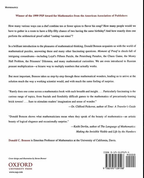 But most important, Benson takes us step by step through these many mathematical wonders, so that we arrive at the solution much the way a working scientist would-and with much the same feeling of surprise. Every fan of mathematical puzzles will be enthralled by The Moment of Proof. Indeed, anyone interested in mathematics or in scientific discovery in general will want to own this book.