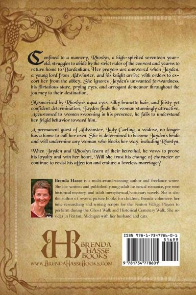 Confined to a nunnery, Rhoslyn, a high-spirited seventeen-year-old, struggles to abide by the strict rules of the convent and yearns to return home to Bardenham. Her prayers are answered when Jayden, a young lord from Aldwinster, and his knight arrive with orders to escort her from the abbey. She ignores Jayden's unwanted forwardness, his flirtatious stare, prying eyes, and arrogant demeanor throughout the journey to their destination. Mesmerized by Rhoslyn's aqua eyes, silky brunette hair, and feisty yet confident determination, Jayden finds the woman stunningly attractive. Accustomed to women swooning in his presence, he fails to understand her frigid behavior toward him. A permanent guest of Aldwinster, Lady Carling, a widow, no longer has a home to call her own. She is determined to become Jayden's bride and will undermine any woman who blocks her way, including Rhoslyn. When Jayden and Rhoslyn learn of their betrothal, he vows to prove his loyalty and win her heart. Will she trust his change of character or continue to resist his affection and endure a loveless marriage?