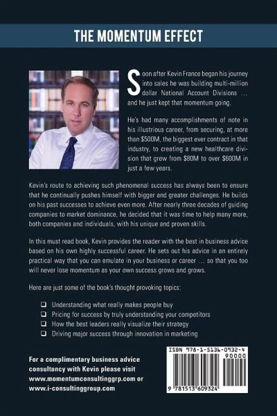 The Momentum Effect is a business book that describes one man's journey through various corporate America positions and includes key learnings and strategic thinking at the end of each chapter. The Momentum Effect is an exceptional example of how anyone can become who they aspire to be. As in the case of the author, Kevin France, who began in a sales position and steadily grew his career until finally venturing off on his own and founding a wildly successful global consulting firm that builds multi-national businesses worldwide.