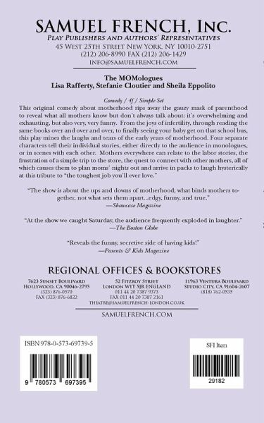 Comedy Characters: 4 female Simple Set This original comedy about motherhood rips away the gauzy mask of parenthood to reveal what all mothers know but don't always talk about: it's overwhelming and exhausting, but also very, very funny. From the joys of infertility, through reading the same books over and over and over, to finally seeing your baby get on that school bus, this play mines the laughs and tears of the early years of motherhood. Four separate characters tell their individual