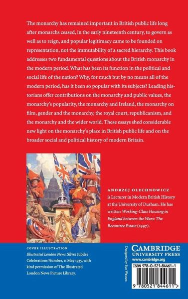 The monarchy has remained important in British public life long after monarchs ceased, in the early nineteenth century, to govern as well as to reign, and popular legitimacy came to be founded on representation, not the immutability of a sacred hierarchy. This book addresses two fundamental questions about the British monarchy in the modern period. What has been its function in the political and social life of the nation? Why, for much but by no means all of the modern period, has it been so popular with its subjects? Leading historians offer contributions on the monarchy and public values, the monarchy's popularity, the monarchy and Ireland, the monarchy on film, gender and the monarchy, the royal court, republicanism, and the monarchy and the wider world. These essays shed considerable new light on the monarchy's place in British public life and on the broader social and political history of modern Britain.