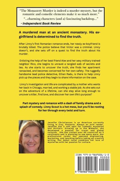 Part mystery and romance with a dash of family drama and a splash of comedy. Linny Scout is a hot mess, but you'll be rooting for her through every twist and turn. ¿¿¿A murdered man at an ancient monastery. His ex-girlfriend is determined to find the truth. After Linny's first Romanian romance ends, her newly ex-boyfriend is brutally killed. The police believe that Victor was a criminal. Linny doesn't, and she sets off a quest to find the truth about his murder. Enlisting the help of her best friend Alex and her sexy military trained neighbor Rico, she begins to unravel a tangled web of secrets and lies. As she starts to uncover the truth, she finds her apartment ransacked, and becomes concerned for her own safety. The ruggedly handsome lead police detective, Ethan Radu, is there to help Linny pick up the pieces and they begin to share information on the case. Linny's investigation and life are complicated by a mother who wants her back in Chicago, married, and working a stable job. As she sets out on the adventure of a lifetime, can she stay alive long enough to uncover a killer, find love, and discover her own life's purpose? The Monastery Murder is Emily in Paris meets Stephanie Plum. It is sure to keep you reading until the very last page.