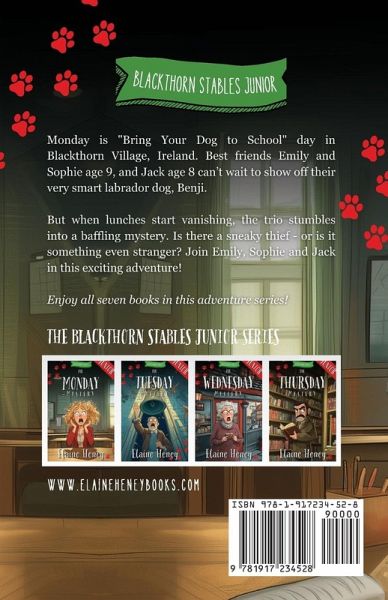 Monday is "Bring Your Dog to School" day in Blackthorn Village, Ireland. Best friends Emily and Sophie age 9, and Jack age 8 can't wait to show off their very smart labrador dog, Benji. But when lunches start vanishing, the trio stumbles into a baffling mystery. Is there a sneaky thief - or is it something even stranger? Join Emily, Sophie & Jack in this exciting adventure! Encouraging Children to Read: Reading is essential for children's cognitive development, language skills, and creativity. Books like this encourage children to engage with exciting stories, build their vocabulary, and develop a lifelong love of reading. Make reading easy & fun for children, including those with dyslexia & reluctant readers: Early Reader Book: Suitable for a reading level of 6 and 7 years. Uses large text and lots of pictures. Perfect for young readers who love adventure, mystery and dogs! Suitable for Reluctant Readers: Exciting enough for kids up to age 10 to enjoy. Encourages Reading Confidence: With easy-to-follow chapters and an engaging story, this book helps young readers build their confidence and love for reading. Engaging plot: The adventure-filled storyline captures the attention of both reluctant readers and those who may struggle with dyslexia. Dyslexia-Friendly Design: Printed in a special font and layout designed to make reading easier for everyone, including children with dyslexia. Printed on cream paper: Cream paper helps to reduce glare and makes this book easier to read! Collect the full series: Enjoy all seven books, one book for every day of the week! Ready to discover what's really happening to those missing lunches? Join Emily, Sophie, Jack, and Benji in this exciting adventure and grab your copy today!