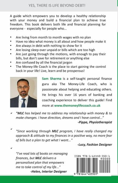 A guide which empowers you to develop a healthy relationship with your money and build a financial plan to achieve true freedom. This book delivers both life and financial planning for everyone - especially for people who... Are living from month to month wages with no plan? Have no idea what money is all about and how people make it? Are always in debt with nothing to show for it? Are losing sleep over unpaid or bills which are too high? Are just going through the motions, with enough to pay their bills, but don't save for retirement or anything else? Are confused by all the financial jargon? The Money-life Coach is the place to start gaining the control back in your life! Live, learn and be prosperous! Sam Sharma is a self-taught personal finance guru aka The Money-Life Coach, who is passionate about helping and educating others. He brings his over 16 years of banking and coaching experience to deliver this guide! Find more at www.themoneylifecoach.co.uk "MLC has helped me to address my relationship with money & to make changes. I have direction, dreams and I have control..." -Pippa, Physiotherapist "Since working through MLC program, I have really changed my approach & attitude to my finances in a positive way, no more fear of bills but a plan to get what I want..." -Lucy, Fashion Designer "I've read lots of books on managing finances, but MLC delivers a personalised plan that empowers me to take control of my life..." -Helen, Interior Designer