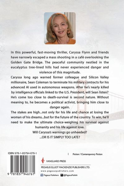 In this powerful, fast-moving thriller, Caryssa Flynn and friends have narrowly escaped a mass ¿shooting in a café overlooking the Golden Gate Bridge. The peaceful community nestled in the ¿eucalyptus tree-lined hills had never experienced danger and violence of this magnitude. ¿ Caryssa long ago warned former colleague and Silicon Valley millionaire, Sean Coleman to ¿terminate his military contracts for his advanced AI used in autonomous weapons. After he's ¿nearly killed by intelligence officials linked to the U.S. President, will Sean listen?¿ He's come too close to death-survival is second nature. Without meaning to, he becomes a ¿political activist, bringing him close to danger again. ¿ The stakes are high...not only for his life and chance at losing the woman of his dreams...but for ¿the future of the country. To win, he'll need to make the ultimate choice-weighing his survival ¿against humanity and his life against love. ¿ Will Caryssa's warnings go unheeded?¿ ¿ ...OR IS IT SIMPLY TOO LATE?