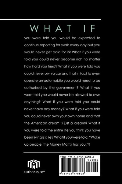 What if you were told you would be expected to continue reporting for work every day but you would never get paid for it? What if you were told you could never become rich no matter how hard you tried? What if you were told you could never own a car and that in fact to even operate an automobile you would need to be authorized by the government? What if you were told you would never be allowed to own anything? What if you were told you could never have any money? What if you were told you could never own your own home and that the American dream is just a dream? What if you were told the entire life you think you have been living is a lie? What if you were told, "Wake up people, the Money Matrix has you."?