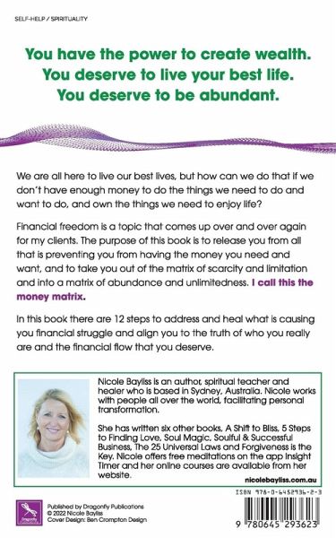 We are all here to live our best lives, but how can we do that if we don't have enough money to do the things we need to do and want to do, and own the things we need to enjoy life? Financial freedom is a topic that comes up over and over again for my clients. The purpose of this book is to release you from all that is preventing you from having the money you need and want, and to take you out of the matrix of scarcity and limitation and into a matrix of abundance and unlimitedness. I call this the money matrix. In this book there are 12 steps to address and heal what is causing you financial struggle and align you to the truth of who you really are and the financial flow that you deserve.