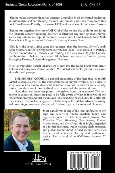 "Skyrm makes complex financial scenarios accessible to all interested readers in an informative and entertaining manner. We can all learn something from this book." -Thomas Peterffy, Chairman, CEO, and President of Interactive Brokers "Skyrm put together the story of MF Global like no one else could in providing the ultimate autopsy covering destructive financial engineering that's played such a big role in our capital markets." -Lawrence G. McDonald, New York Times best selling author of A Colossal Failure of Common Sense "God is in the details...first come the reporters, then the lawyers. Skyrm's book is the necessary antidote. Only someone who has 'done' it can explain it. Perhaps the best 'counterfactual' rationale for reading The Money Noose: If John Corzine had been able to before, there would likely have been no after." -Stan Jonas, Managing Partner, Axiom Management Partners In 2010, President Barack Obama signed into law the Dodd-Frank Wall Street Reform and Consumer Protection Act. MF Global was bankrupt less than a year after the law's passage. THE¿MONEY¿NOOSE is a general accounting of the facts that led to MF Global's collapse, as well as the story of the major players involved. It is a chaotic story, one in which individual actions taken in and of themselves are relatively minor. But the sum of those individual actions equal the same end result. How, then, can investors protect themselves from this outcome? The best answer is education. Investors need to be fully aware of what is involved in the investment process, and that includes an understanding of seg funds. It is, after all, their money. This book is designed to tell the story of MF Global, what went wrong and how things came to an abrupt end. In those regards, it's an incredible story. Scott E.D. Skyrm is one of the leading figures in the repo and securities finance markets today, and regularly quoted in The Wall Street Journal, The Financial Times, Bloomberg News Service, Reuters, Market News, and Dow Jones. He is highly regarded as a former salesman, trader, trading desk manager, and global business head in fixed-income, securities finance, and securities clearing and settlement. He recently left Newedge, where he was their "Global Head of Repo, Money Markets, and Fixed Income Clearing." He now is writing commentaries on the repo market, the short-end of the Treasury market, Federal Reserve policy and general Wall Street topics. He has worked on Wall Street for over 22 years and has taken billion-dollar risks on the trading floor, managed a multi-billion dollar balance sheet, and consistently ran one of the most profitable trading groups at every firm where he worked. Prior to Newedge, he managed the repo desk at ING Barings, worked summers at Shearson Lehman/American Express and started his full-time career at The Bank of Tokyo.