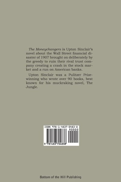 The Moneychangers is Upton Sinclair's novel about the Wall Street financial disaster of 1907 brought on deliberately by the greedy to ruin their rival trust company creating a crash in the stock market and a run on American banks. Upton Sinclair was a Pulitzer Prize-winning who wrote over 90 books, best known for his muckraking novel, The Jungle.