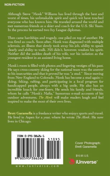 Although Steve 'Monk" Williams has lived through the best and worst of times, his unbreakable spirit and quick wit have touched everyone who has known him. He traveled around the world and met numerous friends as a skier and coach for the U.S. Ski Team. In the process he earned two Ivy League diplomas. Then came hardships and tragedy, one piled on top of another. He was fired as coach. Soon after, Monk was diagnosed with multiple sclerosis, an illness that slowly took away his job, ability to speak clearly and ability to walk. MS didn't, however, weaken his spirit. Neither did the sudden death of his wife, nor his isolation as the youngest resident in an assisted living home. Monk's room is filled with photos and lingering vestiges of his past. He says cross-country skiing for the national team was the answer to his insecurities and that it proved he was 'a stud." Since moving from New England to Colorado, Monk has become a stud again - skiing, biking, rafting, and participating in a local program for handicapped people, always with a big smile. He also has an incredible knack for one-liners. He sends his family and friends, whom he calls 'Monk's Mafia," humorous e-mail accounts of his outdoor adventures. The Monk will make readers laugh and feel inspired to make the most of their own lives.