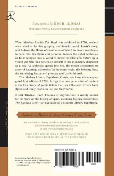 When Matthew Lewis’s The Monk was published in 1796, readers were shocked by this gripping and horrific novel. Lewis’s story, which drove the House of Commons—of which he was a member—to deem him licentious and perverse, follows the abbot Ambrosio as he is tempted into a world of incest, murder, and torture by a young girl who has concealed herself in his monastery disguised as a boy. As Ambrosio spirals into hell, the reader encounters an array of haunting characters: the innocent virgin, the Bleeding Nun, the Wandering Jew, an evil prioress, and Lucifer himself. This Modern Library Paperback Classic, set from the unexpurgated first edition of 1796, brings to a new generation of readers a timeless classic of gothic fiction that has influenced writers from Byron and Emily Brontë to Poe and Hawthorne.
