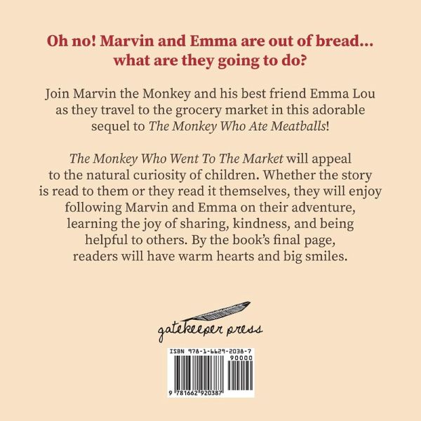 Oh no! Marvin and Emma are out of bread... what are they going to do? Join Marvin the Monkey and his best friend Emma Lou as they travel to the grocery market in this adorable sequel to The Monkey Who Ate Meatballs! "The Monkey Who Went To The Market" will appeal to the natural curiosity of children. Whether the story is read to them or they read it themselves, they will enjoy following Marvin and Emma on their adventure and learning the joy of sharing, kindness and being helpful to others. By the books final page, readers will have warm hearts and big smiles.