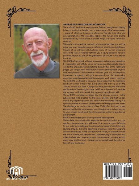ANDRAS SELF DEVELOPMENT WORKBOOK The ANDRAS workbook explores new fields of thought and feeling in human motivation, helping you to make sense of life's experiences - some of which, at times, overwhelm us. The aim is to give you an explanation of the incredible logic of the human mind and to understand why we continue to do the things we would rather not do at all. This study has immediate rewards as it is supposed that you will be using your own experiences as a reference at all times. Insights not thought of up until now will challenge many of your set ideas and your world-view. It will also motivate you in your persistency for your personal search for one of the greatest of all virtues - your search for truth. This ANDRAS workbook will give you answers to long-asked questions. By responding as truthfully as you can (even to asking people close to you for the answers) when completing the activities on the right hand pages, you will get inner satisfaction in realms philosophical, physical and metaphysical. This workbook will also give you techniques to implement change that will give you control over the day-to-day unwanted repeating patterns that consume so much energy and time. The ANDRAS workbook is based on the premise that the individual can be in control of his or her own destiny and that we create the 'reality' we call our 'fate'. Change can take place in your life by the application of free thought-power and free will-power - if you take the necessary effort to unlock that power of thought and will. The ANDRAS workbook explains how the pictures we carry in the subconscious mind creates the life in our destiny and that we can access any negative pictures and resolve the associated feeling in a symbolic process to create a chosen picture reflecting your real worth. The challenge to you is to learn HOW TO BELIEVE in those chosen pictures and let the pictures and your thoughts move in harmony on to your chosen words and then into planned action to productive achievement. Belief is the hardest part of any personal development. The ANDRAS workbook also explains the mechanics that you can apply to the processes you will learn. How you can assert influence in your outer surroundings with a strong inner sense of conviction and sound principle. This is the beginning of genuine inner knowing and you are introduced to the Wisdom Grid, which, in conjunction with the tool of Choice, will deepen your understanding of individual and collective behaviors to prompt you to communicate at a deeper and much more intuitive level - being true to yourself and the universal laws of love and grace.