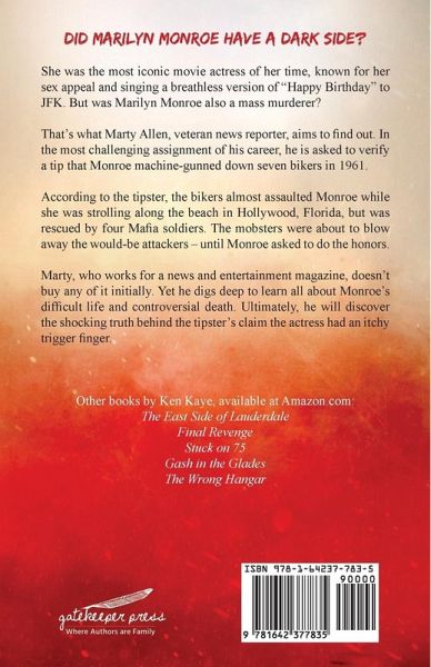 Marty Allen, veteran news reporter, is given the most challenging assignment of his career: determine if iconic movie actress Marilyn Monroe machine-gunned down seven bikers in 1961. At the same time, he wants to know why his girlfriend, a hard-nosed police detective, left him for a cop who abuses women and breaks legs, a quest that will nearly cost him his life. According to a tipster, the bikers almost assaulted Monroe while she was strolling along the beach in Hollywood, Florida. But four mafia soldiers, secretly providing her protection at the behest of their boss, rescued her. They were…mehr
