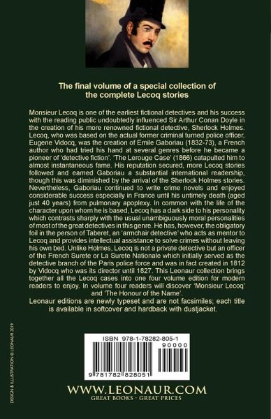 The final volume of a special collection of the complete Lecoq stories Monsieur Lecoq is one of the earliest fictional detectives and his success with the reading public undoubtedly influenced Sir Arthur Conan Doyle in the creation of his more renowned fictional detective, Sherlock Holmes. Lecoq, who was based on the actual former criminal turned police officer, Eugene Vidocq, was the creation of Emile Gaboriau (1832-73), a French author who had tried his hand at several genres before he became a pioneer of ‘detective fiction’. ‘The Lerouge Case’ (1866) catapulted him to almost instantaneous fame. His reputation secured, more Lecoq stories followed and earned Gaboriau a substantial international readership, though this was diminished by the arrival of the Sherlock Holmes stories. Nevertheless, Gaboriau continued to write crime novels and enjoyed considerable success especially in France until his untimely death (aged just 40 years) from pulmonary apoplexy. In common with the life of the character upon whom he is based, Lecoq has a dark side to his personality which contrasts sharply with the usual unambiguously moral personalities of most of the great detectives in this genre. He has, however, the obligatory foil in the person of Taberet, an ‘armchair detective’ who acts as mentor to Lecoq and provides intellectual assistance to solve crimes without leaving his own bed. Unlike Holmes, Lecoq is not a private detective but an officer of the French Surete or La Surete Nationale which initially served as the detective branch of the Paris police force and was in fact created in 1812 by Vidocq who was its director until 1827. This Leonaur collection brings together all the Lecoq cases into one four volume edition for modern readers to enjoy. In volume four readers will discover, ‘Monsieur Lecoq’ and ‘The Honour of the Name’. Leonaur editions are newly typeset and are not facsimiles; each title is available in softcover and hardback with dustjacket.