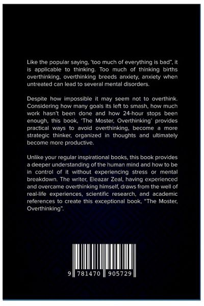 Do you often find yourself overthinking? Is it typical for you to have a conflict of thoughts and you have been thinking of ways to stop overthinking? The Monster, Overthinking is the book you need to stop overthinking. The author succinctly explains the subject matter and identifies different ways to combat anxiety that leads to overthinking. In this book, you will also find out that stress is another major cause of overthinking. The question then becomes how do you combat overthinking caused by stress? The book reveals the 5-4-3-2-1 technique used to deal with panic attacks. The author recommended the 4 A's of stress management, which includes: ¿ Avoiding what you cannot control ¿ Altering the stressors ¿ Accepting them ¿ Adapting to cope with stressors. Poor time management and input have been identified as another cause of anxiety which inadvertently leads to overthinking. To manage our time properly, the book discussed some techniques to follow, such as Allen's input processing method, and setting SMART goals. Finding instant calmness is a proven way to stop anxiety and one of the techniques you get from this book is antigenic training which will help you to gain control over your thoughts and emotions following six different exercises. You will also find Cognitive Behavioral Therapy within the pages of this book which can help to identify negative thought patterns and replace them with positive thought patterns. Doing this will not only change your way of thinking, but it will also improve your mental health. Overall, the book "The Monster, Overthinking" provides a comprehensive guide on how to reduce overthinking and anxiety. It covers various techniques such as stress management, time management, finding instant Zen, rewiring thought patterns and emotional regulation. The author emphasizes the importance of living in the present and focusing on what you can control, do, and have. The book is a valuable resource for anyone who struggles with overthinking and anxiety, providing practical and effective strategies for managing and overcoming these issues.