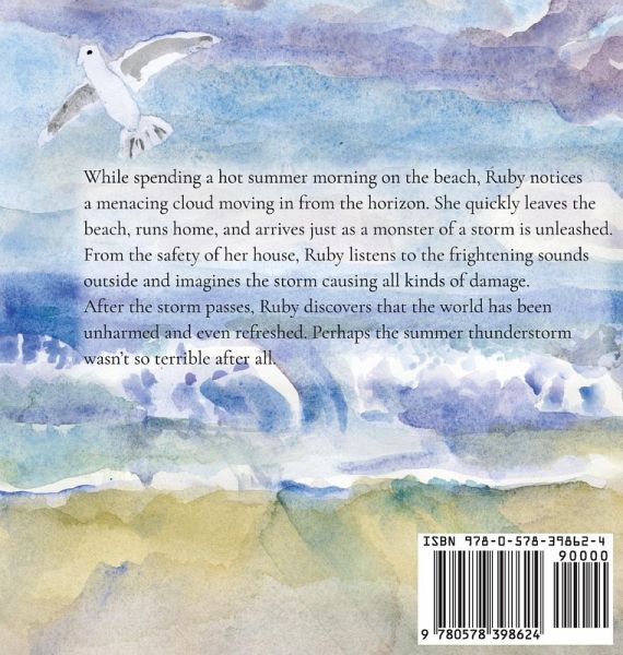 While spending a hot summer morning on the beach, Ruby notices a menacing cloud moving in from the horizon. She quickly leaves the beach, runs home, and arrives just as a monster of a storm is unleashed. From the safety of her house, Ruby listens to the frightening sounds outside and imagines the storm causing all kinds of damage. After the storm passes, Ruby discovers that the world has been unharmed and even refreshed. Perhaps the summer thunderstorm wasn't so terrible after all.