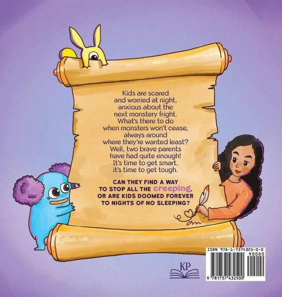 What's a child to do when monsters show up in those creepy dark places - aside from covering their sweet little faces? When trouble is near, it's Mom and Dad to the rescue! And these brave parents are not without a plan to solve this or any future monstery woes. After a long run through an In-Between world and a nail-biting standoff, they gather the monsters together to explain how their sneaking and spying are scaring the children. Imagine the monsters' surprise! After all, they'd only wanted to take a quick peek - a monstery game of hide-and-go-seek. Can they work together to come up with a way to stop all the creeping? Or are kids doomed forever to nights of no sleeping? If they can agree, this could be the beginning of more restful nights, and a lot less fear.