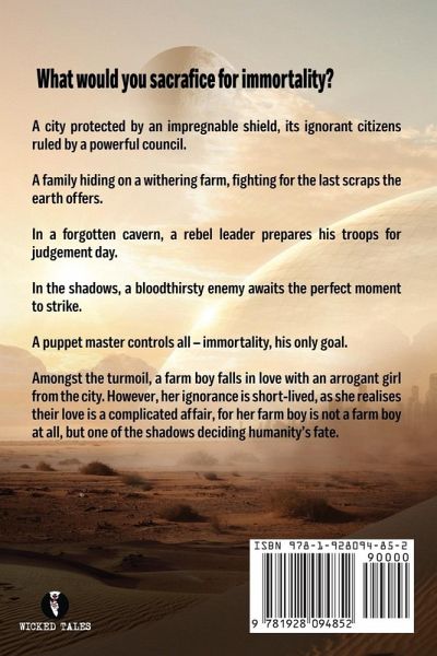 A city protected by an impregnable shield, its ignorant citizens ruled by a powerful council. A family hiding on a withering farm, fighting for the last scraps the earth offers. In a forgotten cavern, a rebel leader prepares his troops for judgement day. In the shadows, a bloodthirsty enemy awaits the perfect moment to strike. A puppet master controls all - immortality, his only goal. Amongst the turmoil, a farm boy falls in love with an arrogant girl from the city. However, her ignorance is short-lived, as she realises their love is a complicated affair, for her farm boy is not a farm boy at all, but one of the shadows deciding humanity's fate.