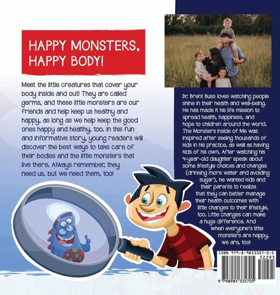 *NEW* The updated 2nd Edition now has a FUN ACTIVITY GUIDE for kids and their caregivers. Bring the book to life with these new activities and help to really instill a healthy lifestyle in our future generations! Prepare your child for a healthy life with this fun, educational picture book by father and health professional Dr. Brent Buss. Introduce a child in your life to the little creatures that cover your body inside and out - their own little monsters, a.k.a germs! As long as we keep them happy and healthy, then we will be happy and healthy too. They help us digest our food, keep our bodies healthy, and when bad monsters get into our body they help kick them out. The Monsters Inside of Me goes through some of the best ways for us to keep our own little monsters happy with bright, bold artwork and engaging, accessible narration:Drink water - your good monsters drink water more than anything else! Eat nature food - fruit, vegetables, and anything that nature created are what our little monsters crave the most Sleep - getting enough sleep helps your little monsters be ready for the next day Movement - moving keeps us energetic and feels great! The Monsters Inside of Me is perfect for:Parents looking for a fun, educational way to inspire their kids to cultivate healthy habits for life Health professionals who want a great tool to help educate their patients or clients Grandparents looking for the perfect gift for their grandchildren Classroom libraries and any teacher wanting to teach about germs, hygiene and healthy habits