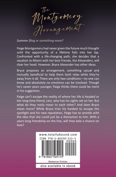 Summer fling or something more? Paige Montgomery had never given the future much thought until the opportunity of a lifetime falls into her lap. Confronted with a life-changing path, she decides that a vacation to Miami with her best friends, the Alexanders, will clear her head. However, Bryce Alexander has other ideas. Bryce proposes an arrangement, something casual and mutually beneficial to help them both relax while they're away from it all. There are only two conditions-no one can know and absolutely no emotions can be involved. Though he's seven years younger, Paige thinks there could be merit in his suggestion. Paige can't escape the reality of where her life is headed or her long-time friend, Levi, who has his sights set on her. But what do they really mean to each other? And does Bryce mean more? While Bryce tries his hardest to escape the spotlight and his new reputation, Paige has to wrestle with the idea that she could just be a distraction to him. With a years-long friendship on the line, will they take a chance on love?