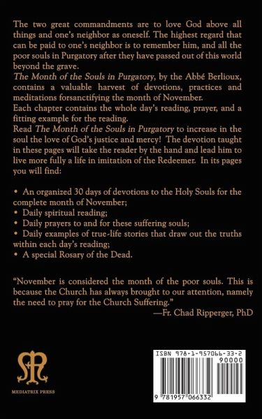 The two great commandments are to love God above all things and one's neighbor as oneself. The highest regard that can be paid to one's neighbor is to remember him, and all the poor souls in Purgatory after they have passed out of this world beyond the grave. This is why man needs the liturgical month of November. The season has passed from the heat of summer to the crispness of Autumn with all its bounty. Many reap from the gardens and fields that which God graciously bestowed to them through the labor of their hands. Harvests are celebrated and preserved in various ways all around the world. Fittingly, we retire with full larder and bursting barns in order to now pull from the treasure of graces and indulgences, that are available at every moment for the relief of the poor souls in Purgatory, again, from our Father's loving hand. To better make use of these graces, and to preserve a holy life, The Month of the Souls in Purgatory, by the Abbé Berlioux, contains a valuable harvest of devotions, practices and meditations toward sanctifying the month of November. The book is excellent as a daily reader for the month, but also very useful for the anniversaries of the deaths of loved ones, whose daily assistance is a chief duty of the Church Militant. Let us remember the dead, and look to our last day as well. Each chapter contains the whole day's reading, prayer, and a fitting example for the reading, usually taken from the author's personal knowledge or some other historical example. The subjects range from the ancientness of praying for the dead, the pains and nature of the suffering, the holiness and nearness to God of the souls, the favors granted by them to those on earth who relieve them, the various means of relieving the poor souls, the ways souls end up in Purgatory and how to avoid these downfalls, as also apparitions by the dead, carrying out the wishes of those who pass before us, an admonition to make provisions in one's own will that supplies for masses and alms against time spent in Purgatory, and more. The readings are short and easy to complete for a morning meditation, between the labors of a busy life, and for raising to a higher level one's entire being toward a particular goal that is common to all men. As one saint said before beginning the November devotions, "Let us empty Purgatory!" The Month of the Souls in Purgatory was first published in the French language in Grenoble. The book was soon after translated for the English-speaking world and published in 1886. The Abbé Berlioux was a priest of the diocese of Grenoble and was the Curé, or parish priest, of the church of St. Bruno. In this work, he calls out to the reader, addressing him by the name, "Christian Soul", in nearly each day's reading as he gets to the point of what the individual could do to utilize and live a Christian life based on a greater devotion to the souls in Purgatory, increasing the seriousness of the tone as well as gripping the attention of the reader with it. Read The Month of the Souls in Purgatory to increase in the soul the love of God's justice and mercy! In its pages you will find: An organized 30 days of devotions to the Holy Souls for the complete month of November Daily spiritual reading on the various truths and means of the devotion A detailed study of the pains and helplessness of Souls in Purgatory, and ways to personally apply the message Daily prayers to and for these suffering souls Daily examples of true-life stories that draw out the truths within each day's reading. A special Rosary of the Dead