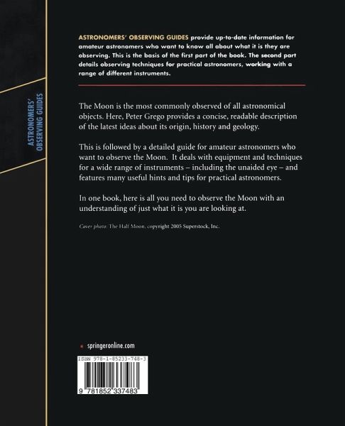 "The Moon and How to Observe It is the latest of Springer-Verlag's Astronomers' Observing Guides. Described as 'an advanced handbook for students of the Moon', it is in fact suitable for amateur astronomers of all levels, beginner as well as advanced. ... The book is illustrated by about 100 photographs and drawings, many of them by Grego himself. ... a detailed and up-to-date guide, ideal for the amateur astronomer who wishes to observe the Moon or simply learn more about it." (Brendan K Ward, Astronomy and Space, June, 2006)