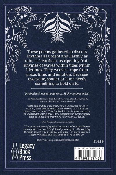 These poems gathered to discuss rhythms as urgent and Earthly as rain, as heartbeat, as ripening fruit. Rhymes of waves within tides within lifetimes. They weave a rope from place, time, and emotion. Because everyone, sooner or later, needs something to hold on to. "Inspired and inspirational verse...Highly recommended!" -Dr. Maja Trochimczyk, President of California State Poetry Society, President of Moonrise Press, and author "With astounding wordcraft and an unceasing sense of wonder, these poems take us on a journey that spans the planet, and the heart...This is a book to put in your backpack, or keep under your pillow. These are poems to devour slowly, on a train heading into new and mysterious lands." -Wess Mongo Jolley, author and editor "The coherent love of synched sounds and related themes ties together the variety of density and light-like walking through forest, into meadow, and back-in ways that can keep contemplation and delight alive as you go." -Don Freas, poet, designer/craftsman, sculptor