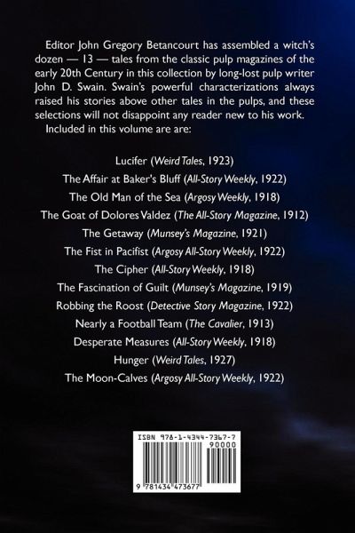 Editor John Gregory Betancourt has assembled a witch's dozen -- 13 -- tales from the classic pulp magazines of the early 20th Century in this collection by long-lost pulp writer John D. Swain. Swain's powerful characterizations always raised his stories above other tales, and these selections will not disappoint readers new to his work. Included in this volume are are: "Lucifer" (Weird Tales, November 1923). "The Affair at Baker's Bluff" (All-Story Weekly, November 27,1922). "The Old Man of the Sea" (Argosy Weekly, June 8, 1918). "The Goat of Dolores Valdez" (The All-Story Magazine, October 1912). "The Getaway" (Munsey's Magazine, March 1921). "The Fist in Pacifist" (Argosy Allstory Weekly, July 1, 1922). "The Cipher" (All-Story Weekly, May 18, 1918). "The Fascination of Guilt" (Munsey's Magazine, August 1919). "Robbing the Roost" (Detective Story Magazine, April 15, 1922). "Nearly a Football Team" (The Cavalier, November 15, 1913). "Desperate Measures" (All-Story Weekly, November 30, 1918). "Hunger" (Weird Tales, October 1927 issue). "The Moon-Calves" (Argosy Allstory Weekly, August 5, 1922).
