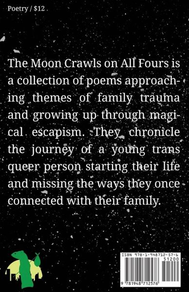 The Moon Crawls on All Fours is a collection of poems approaching themes of family trauma and growing up through magical escapism. They chronicle the journey of a young trans queer person starting their life and missing the ways they once connected with their family.