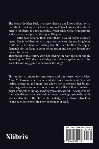 The Moon Goddess Pack is a secret that no one knows about, or so they think. The king of the Lycans, Wayan Feign, knows and sends his men to kill them. It is unsuccessful, which sends Gelia, head gamma and sister to the alpha, to the Lycan Kingdom. Little does either of them know that Gelia and Wayan are fated mates. She is hell-bent on starting a war between the two kingdoms while he is hell-bent on mating her. But her brother, the alpha, demands for the king to come to his realm and see the devastation caused by his men. They travel to this realm, with her leading the way and him blindly following her. Will the travel bring them close together, or is it the start of some long game to dethrone the king?