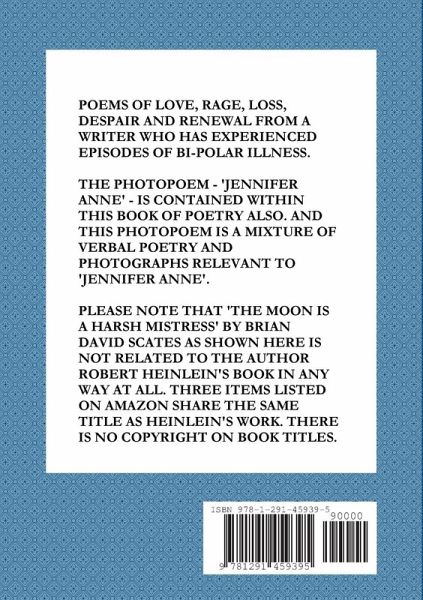 Poems of love, loss, rage, despair and renewal from a writer who has experienced episodes of bi-polar illness.THE PHOTOPOEM - 'JENNIFER ANNE' - IS CONTAINED WITHIN THIS BOOK OF POETRY ALSO AND THIS PHOTOPOEM IS A MIXTURE OF VERBAL POETRY AND PHOTOGRAPHS RELEVANT TO 'JENNIFER ANNE'. THIS BOOK OF POETRY IS IN NO WAY RELATED TO ROBERT HEINLEIN'S BOOK OF THE SAME TITLE. THREE ITEMS LISTED ON AMAZON SHARE THE SAME TITLE AS MY BOOK OF POETRY. THERE IS NO COPYRIGHT ON BOOK TITLES.