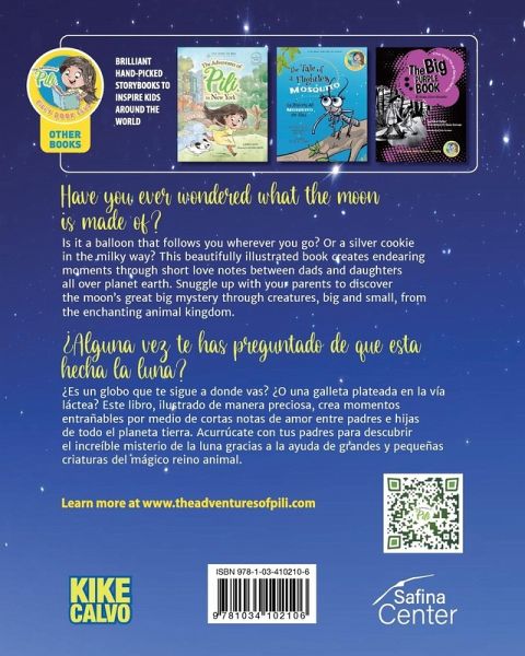 Have you ever wondered what the moon is made of? Is it a balloon that follows you wherever you go? Or a silver cookie in the milky way? This beautifully illustrated book creates endearing moments through short love notes between dads and daughters all over planet earth. Snuggle up with your parents to discover the moon's great big mystery through creatures, big and small, from the enchanting animal kingdom. ---------------------------- ¿Alguna vez te has preguntado de qué está hecha la luna? ¿Es un globo que te sigue a donde vas? ¿O una galleta plateada en la vía láctea? Este libro, ilustrado de manera preciosa, crea momentos entrañables por medio de cortas notas de amor entre padres e hijas de todo el planeta tierra. Acurrúcate con tus padres para descubrir el increíble misterio de la luna gracias a la ayuda de grandes y pequeñas criaturas del mágico reino animal. ---------------------------- ¿It's rare to find a book that creates the necessary awe required to captivate and educate. Parents and children alike will be grateful that Kike has written such a book.¿ Valarie van Cleave Oceana Board of Directors-Chair