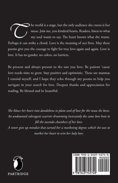 The world is a stage, but the only audience she craves is her muse. Join me, you kindred hearts. Readers, listen to what my soul wants to say. The heart knows what she wants. Perhaps it can strike a chord. Love is the meaning of our lives. May these poems give you the courage to fight for true love again and again. Love is love. It has no gender, no colors, no barriers. Be present and always present to the one you love. Be patient cause love needs time to grow. Stay positive and optimistic. These are mantras I remind myself, and I hope they echo through my poems to help you navigate in your search for love. Deepest thanks and appreciation for reading. Be blessed and be beautiful.