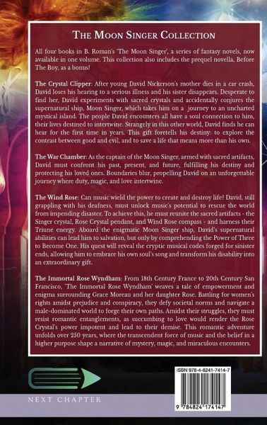All four books in B. Roman's 'The Moon Singer', a series of fantasy novels, now available in one volume. This collection also includes the prequel novella, Before The Boy, as a bonus! The Crystal Clipper: After young David Nickerson's mother dies in a car crash, David loses his hearing to a serious illness and his sister disappears. Desperate to find her, David experiments with sacred crystals and accidentally conjures the supernatural ship, Moon Singer, which takes him on a journey to an uncharted mystical island. The people David encounters all have a soul connection to him, their lives destined to intertwine. Strangely in this other world, David finds he can hear for the first time in years. This gift foretells his destiny: to explore the contrast between good and evil, and to save a life that means more than his own. The War Chamber: As the captain of the Moon Singer, armed with sacred artifacts, David must confront his past, present, and future, fulfilling his destiny and protecting his loved ones. Boundaries blur, propelling David on an unforgettable journey where duty, magic, and love intertwine. The Wind Rose: Can music wield the power to create and destroy life? David, still grappling with his deafness, must unlock music's potential to rescue the world from impending disaster. To achieve this, he must reunite the sacred artifacts - the Singer crystal, Rose Crystal pendant, and Wind Rose compass - and harness their Triune energy. Aboard the enigmatic Moon Singer ship, David's supernatural abilities can lead him to salvation, but only by comprehending the Power of Three to Become One. His quest will reveal the cryptic musical codes forged for sinister ends, allowing him to embrace his own soul's song and transform his disability into an extraordinary gift. The Immortal Rose Wyndham: From 18th Century France to 20th Century San Francisco, 'The Immortal Rose Wyndham' weaves a tale of empowerment and enigma surrounding Grace Moreau and her daughter Rose. Battling for women's rights amidst prejudice and conspiracy, they defy societal norms and navigate a male-dominated world to forge their own paths. Amidst their struggles, they must resist romantic entanglements, as succumbing to love would render the Rose Crystal's power impotent and lead to their demise. This romantic adventure unfolds over 250 years, where the transcendent force of music and the belief in a higher purpose shape a narrative of mystery, magic, and miraculous encounters.