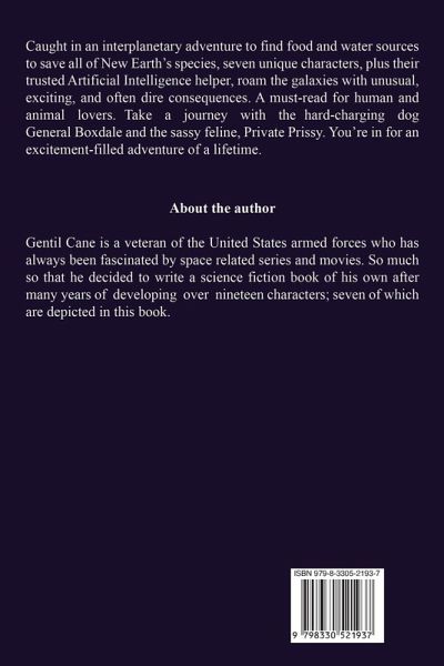 Caught in an interplanetary adventure to find food and water sources to save all of New Earth's species, seven unique characters, plus their trusted Artificial Intelligence helper, roam the galaxies with unusual, exciting, and often dire consequences. A must-read for human and animal lovers. Take a journey with the hard-charging dog General Boxdale and the sassy feline, Private Prissy. You're in for an excitement-filled adventure of a lifetime.