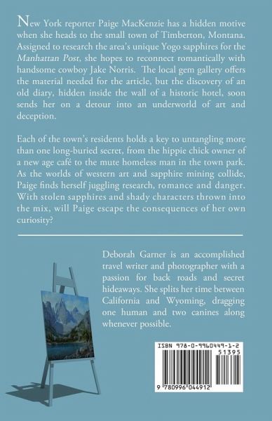 New York reporter Paige MacKenzie has a hidden motive when she heads to the small town of Timberton, Montana. Assigned to research the area's unique Yogo sapphires for the Manhattan Post, she hopes to reconnect romantically with handsome cowboy Jake Norris. The local gem gallery offers the material needed for the article, but the discovery of an old diary, hidden inside the wall of a historic hotel, soon sends her on a detour into the underworld of art and deception. Each of the town's residents holds a key to untangling more than one long-buried secret, from the hippie chick owner of a new age café to the mute homeless man in the town park. As the worlds of western art and sapphire mining collide, Paige finds herself juggling research, romance and danger. With stolen sapphires and shady characters thrown into the mix, will Paige escape the consequences of her own curiosity?