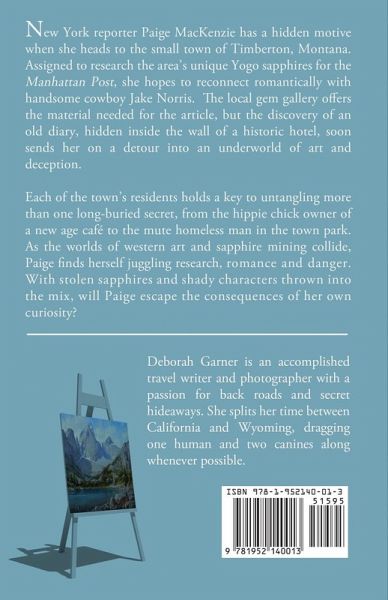 New York reporter Paige MacKenzie has a hidden motive when she heads to the small town of Timberton, Montana. Assigned to research the area's unique Yogo sapphires for the Manhattan Post, she hopes to reconnect romantically with handsome cowboy Jake Norris. The local gem gallery offers the material needed for the article, but the discovery of an old diary, hidden inside the wall of a historic hotel, soon sends her on a detour into the underworld of art and deception. Each of the town's residents holds a key to untangling more than one long-buried secret, from the hippie chick owner of a new age café to the mute homeless man in the town park. As the worlds of western art and sapphire mining collide, Paige finds herself juggling research, romance and danger. With stolen sapphires and shady characters thrown into the mix, will Paige escape the consequences of her own curiosity?