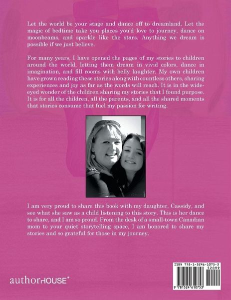 Let the world be your stage and dance off to dreamland. Let the magic of bedtime take you places you'd love to journey, dance on moonbeams, and sparkle like the stars. Anything we dream is possible if we just believe. For many years, I have opened the pages of my stories to children around the world, letting them dream in vivid colors, dance in imagination, and fill rooms with belly laughter. My own children have grown reading these stories along with countless others, sharing experiences and joy as far as the words will reach. It is in the wide-eyed wonder of the children sharing my stories that I found purpose. It is for all the children, all the parents, and all the shared moments that stories consume that fuel my passion for writing. I am very proud to share this book with my daughter, Cassidy, and see what she saw as a child listening to this story. This is her dance to share, and I am so proud. From the desk of a small-town Canadian mom to your quiet storytelling space, I am honored to share my stories and so grateful for those in my journey.