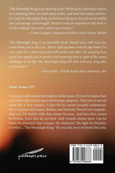 Seoul, Korea 1977. A young couple makes the toughest of decisions. Driven by shame they send their only son far away into foreign adoption. Their son is just six years old. A new country. A new life he cannot possibly understand. He is tortured and beaten. Broken and battered. Forced into unspeakable acts. He builds walls that cannot be seen. And bars that cannot be broken. Scars that do not heal. And wounds always open. Can he battle his demons? And conquer the darkness? The fight for freedom is within... "The Moonlight King" The true life story of Derek DeCosta.