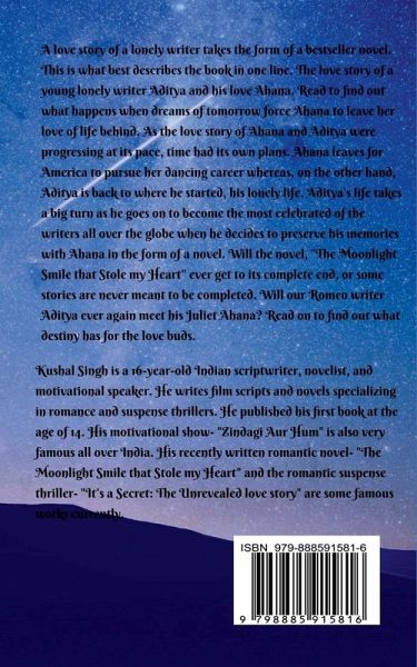 A love story of a lonely writer takes the form of a bestseller novel. This is what best describes the book in one line. The love story of a young lonely writer Aditya and his love Ahana. Read to find out what happens when dreams of tomorrow force Ahana to leave her love of life behind. As the love story of Ahana and Aditya were progressing at its pace, time had its own plans. Ahana leaves for America to pursue her dancing career whereas, on the other hand, Aditya is back to where he started, his lonely life. Aditya's life takes a big turn as he goes on to become the most celebrated of the writers all over the globe when he decides to preserve his memories with Ahana in the form of a novel. Will the novel, ""The Moonlight Smile that Stole my Heart"" ever get to its complete end, or some stories are never meant to be completed. Will our Romeo writer Aditya ever again meet his Juliet Ahana? Read on to find out what destiny has for the love buds.