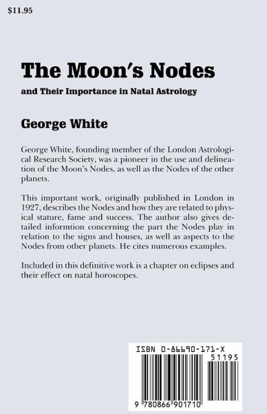George White, founding member of the London Astrological Research Society, was a pioneer in the use and delineation of the Moon's Nodes, as well as the Nodes of the other planets. The Moon's Nodes, originally published in London in 1927, describes the Nodes and how they are related to physical stature, fame and success. The author also gives detailed informtion concerning the part the Nodes play in relation to the signs and houses, as well as aspects to the Nodes from other planets. He cites numerous examples. Included in this definitive work is a chapter on eclipses and their effect on natal horoscopes.
