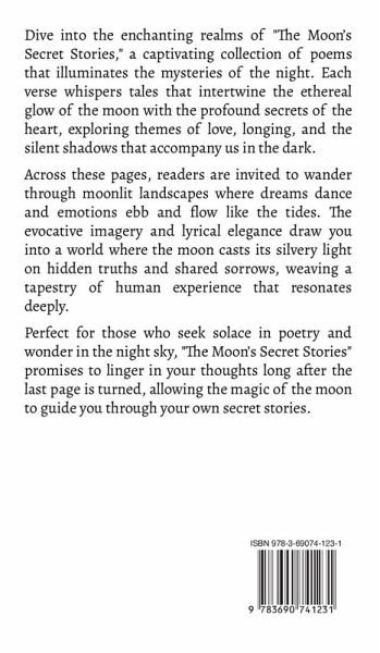 Dive into the enchanting realms of "The Moon's Secret Stories," a captivating collection of poems that illuminates the mysteries of the night. Each verse whispers tales that intertwine the ethereal glow of the moon with the profound secrets of the heart, exploring themes of love, longing, and the silent shadows that accompany us in the dark. Across these pages, readers are invited to wander through moonlit landscapes where dreams dance and emotions ebb and flow like the tides. The evocative imagery and lyrical elegance draw you into a world where the moon casts its silvery light on hidden truths and shared sorrows, weaving a tapestry of human experience that resonates deeply. Perfect for those who seek solace in poetry and wonder in the night sky, "The Moon's Secret Stories" promises to linger in your thoughts long after the last page is turned, allowing the magic of the moon to guide you through your own secret stories.