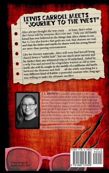 Once upon a time all the legends and stories were true. Animals were people and humans were the lost children in a new and magical world. Then a war between heaven and hell shattered the peace that existed between mortals and immortals. Now thousands of years later a young girl named Alice can see through that veil. She can see the true faces of the gods and demons that exist on the earth alongside the humans that no longer know they are there. Her ability has alienated her from her peers and cast her out of normal society. She has found solace in stories from old books and the kind understanding of an old family friend. When a creature unlike any she has ever seen before explodes into her life she quickly learns that the things she thought were only old stories are very real.Once upon a time all the legends and stories were true. Animals were people and humans were the lost children of a new and magical world. Then a war between heaven and hell shattered the peace that existed between mortals and immortals. The world of magic was hidden from humanity behind an invisible veil. Now thousands of years later a young girl named Alice can see through that veil. She can see the true faces of the gods and demons that exist on the earth alongside the humans that no longer know they are there. Her ability has alienated her from her peers and cast her out of normal society. She has found solace in stories from old books and the kind understanding of an old family friend. When a creature unlike any she has ever seen before explodes into her life she quickly learns that the things she thought were only old stories are very real. She finds herself in the middle of a war that has been fought longer then recorded history. The salvation of the world rests in her hands. But, first she has to try to convince herself it's not one of her delusions.Alice always thought she was crazy . . . at least, that's what she's been told by everyone she's ever met. Only one old family friend has ever believed the things Alice claims to see. But Li Tzu also knows that gods are real, that demons are real, and that the fables and myths he shares with his young friend are more than passing entertainment. Like her literary namesake, Alice will soon find herself being chased down a "rabbit hole", but one much more ancient and far darker than any whimsical trip to Wonderland. Aided by a wily Fox and pursued by a legendary warrior as old as time itself, she will be caught in the middle of a millenia-old battle between the Heavens and Hell . . . all the while searching for a very different kind of missing Rabbit: a powerful creature who, long ago, was willing to make the ultimate sacrifice . . .