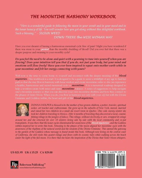 Have you ever dreamt of having a harmonious menstrual cycle free of pain? Might you have wondered if there was more to your period than the monthly shedding of blood? Did you ever feel that there was a deeper purpose and meaning to your monthly cycle? Do you feel the need to be alone and quiet with a yearning to tune into yourself when you are flowing? Does your intuition tell you that if you do, not just your body, but your mind and emotions will flow freely? Have you ever been inspired to squat onto mother earth while in your moontime and felt her energy connecting with yours? Well now is the time to come home to yourself and reconnect with the deeper meaning of the blood mysteries. This workbook is a start. It is designed to be a guide to assist a wombyn of any age to find her path so that she may flow in harmony with lunar wisdom and create moontime order so she can experience a healthy, harmonious and sacred menstrual cycle or moontime.It is a menstrual roadmap designed to help a wombyn create both inner and outer moontimebalance. A series of suggestions to help navigate one's moontime journey so that you can discover your own moontime rhythms and how they connect to the phases of Sister Moon. When you do, you flow in harmony not only with your self, but with the Divine Feminine and Goddess within, the heart and gift of the blood mysteries. About the author: DONNA WOLPER is blessed to be the mother of two grown children, a potter, traveler, spiritual seeker, art teacher and craftswoman. She grew up in the suburbs of New York, moved, married and raised her two children in a small ski resort town in Quebec. One cold, snowy winter she took her children traveling to Mexico. After 4 months of traveling they discovered a rural, coastal, fishing village in the jungles of Jalisco. This village, without electricity or cars, wrapped its wings around her and she returned for over 18 winters living side by side with the local community and ex-pat transplants. It was there that the lunar cycles illuminated her awareness of the blood mysteries, and the Goddess within inspired her to write this book. Attuning to the phases of the moon aligned her moontime cycle with the awareness of the rhythms of the natural world and the wisdom of the Divine Feminine. This opened the gateway to the garden of the Goddess whose message is found inside this book. Donna now lives on the central coast of California, and still visits this quaint village and flows with its oceanic tides while walking across the beach under the light of the full moon. It is there that she hears the inspiration of the Divine that Sister Moon whispers.