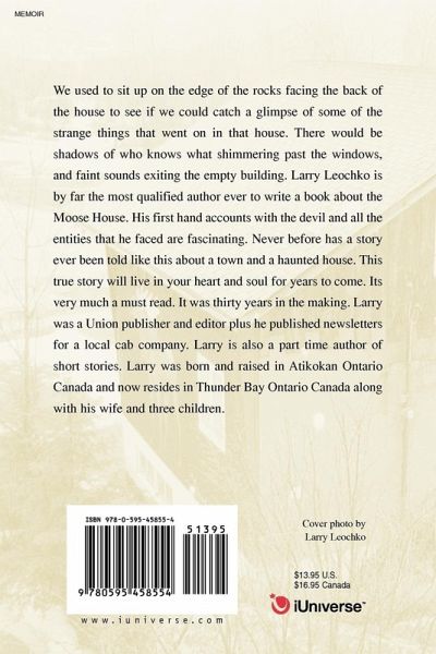 We used to sit up on the edge of the rocks facing the back of the house to see if we could catch a glimpse of some of the strange things that went on in that house. There would be shadows of who knows what shimmering past the windows, and faint sounds exiting the empty building. Larry Leochko is by far the most qualified author ever to write a book about the Moose House. His first hand accounts with the devil and all the entities that he faced are fascinating. Never before has a story ever been told like this about a town and a haunted house. This true story will live in your heart and soul for years to come. Its very much a must read. It was thirty years in the making. Larry was a Union publisher and editor plus he published newsletters for a local cab company. Larry is also a part time author of short stories. Larry was born and raised in Atikokan Ontario Canada and now resides in Thunder Bay Ontario Canada along with his wife and three children.
