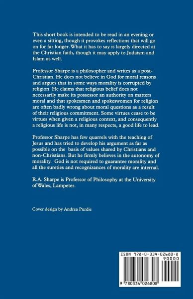 This short book is intended to be read in an evening or even a sitting, though it provokes reflections that will go on for far longer. What it has to say is largely directed at the Christian faith, though it may apply to Judaism and Islam as well. Professor Sharpe is a philosopher and writes as a post-Christian. He does not believe in God for moral reasons and argues that in some ways morality is corrupted by religion. He claims that religious belief does not necessarily make its possessor an authority on matters moral and that spokesmen and spokeswomen for religion are often badly wrong about moral questions as a result of their religious commitment. Some virtues cease to be virtues when given a religious context, and consequently a religious life is not, in many respects, a good life to lead. Professor Sharpe has few quarrels with the teaching of Jesus and has tried to develop his argument as far as possible on the basis of values shared by Christians and non-Christians. But he firmly believes in the autonomy of morality. God is not required to guarantee morality and all the sureties and recognizances of morality are internal.